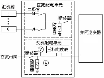 內(nèi)含直流配電單元和交流配電單元,其中直流配電單元主要是將匯流箱輸入的直流電源進行匯流后接入逆變器,該配電單元含直流輸入斷路器、防反二極管、光伏防雷器;交流配電單元主要是通過配電給逆變器提供并網(wǎng)接口,該配電單元含網(wǎng)側(cè)斷路器、防雷器,配置發(fā)電計量表、逆變器并網(wǎng)接口及交流電壓電流表等裝置。